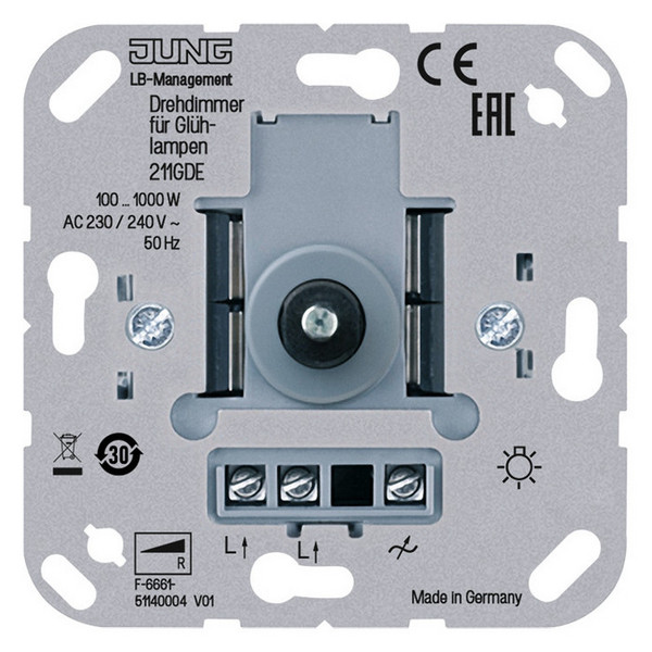 Механизм поворотного светорегулятора-переключателя Jung коллекции JUNG, 1000 Вт, скрытый монтаж, 211GDE - это качественное устройство, предназначенное для регулировки яркости освещения и переключения света в помещении. Стильный дизайн и надежное исполнение делают этот механизм идеальным выбором для любого интерьера. С его помощью вы сможете легко создать комфортную атмосферу в своем доме или офисе. Установка этого механизма осуществляется скрытым способом, что придает интерьеру более эстетичный вид. Максимальная мощность 1000 Вт обеспечивает возможность управления освещением на больших площадях. Поворотной механизм делает использование устройства удобным и интуитивно понятным. Переключатель позволяет легко изменять режимы освещения в зависимости от ваших потребностей. Общее качество и надежность продукции Jung гарантируют долгий срок службы этого механизма.