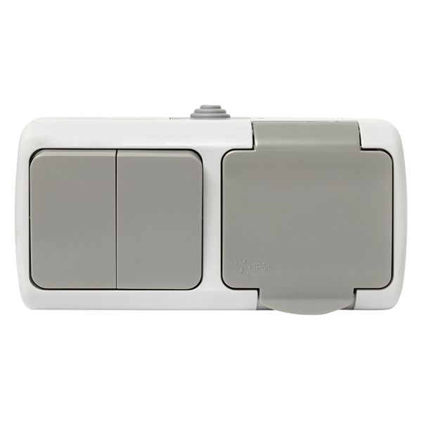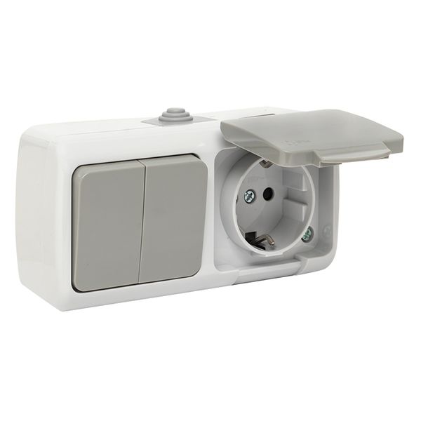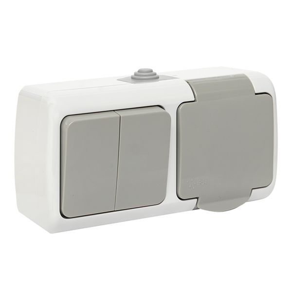 Блок из двухклавишного выключателя и розетки EKF серии Мурманск позволяет организовать электроснабжение в условиях высокой влажности и пыльных помещениях, на улице при условии установки под навесом. Ступенчатые герметичные вводы с двух сторон изделия обеспечивают надежную защиту, позволяя использовать устройство в агрессивных условиях.