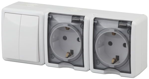 11-7404-01 ЭРА Блок две розетки+выключатель двойной IP54, 16A(10AX)-250В, ОУ, Эра Эксперт, белый (5/ Гарантия2 года