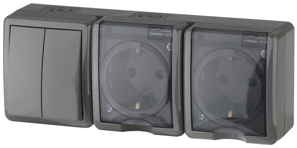 11-7404-03 ЭРА Блок две розетки+выключатель двойной IP54, 16A(10AX)-250В, ОУ, Эра Эксперт, серый (5/ Вид монтажаОткрытый
