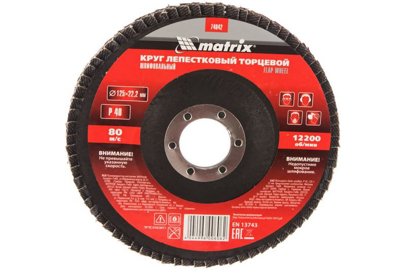 Круг лепестковый торцевой, P 40, 125 х 22,2 мм// MATRIX - это абразивный круг, предназначенный для шлифовки и обработки различных поверхностей. Имеет диаметр 125 мм и посадочное отверстие 22,2 мм. Зернистость P 40 обеспечивает эффективное удаление материала и обработку поверхности. Продукт отличается высоким качеством и долгим сроком службы, что делает его незаменимым инструментом для профессиональных строителей и мастеров.
