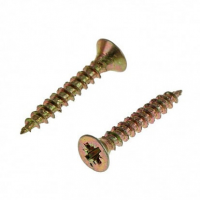 Саморез универсальный, покрытие - желтый цинк. Применяется для прямого крепления различных изделий к деревянным конструкциям и к прочным материалам (бетон, кирпич, камень) через дюбель. Также применяются совместно с любыми видами пластиковых дюбелей (для полнотелых и пустотелых конструкций), для сборки деревянных конструкций и металлических конструкций (с предварительным сверлением). Желтый цинк считается более прочным покрытием. Часто применяется в отделке в местах, где шляпка остается видимой.