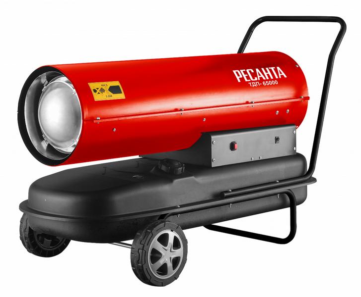 Ресанта ТДП-65000 – это дизельная теплопушка прямого нагрева мощностью 65 кВт и производительностью 2000 м³/ч. Она способна обеспечить быстрый обогрев производственного, строительного или другого нежилого объекта.Принцип работы устройства основан на передаче тепла, полученного при сгорании топлива. Теплопушка оснащена топливным баком объемом 56 л, такого запаса хватает на 10 ч непрерывного использования агрегата. В качестве топлива может использоваться керосин. Вес установки составляет 30 кг, для простоты перемещения она размещена на раме с колесами и ручкой. Дизельная тепловая пушка имеет все виды защиты: от угасания пламени, от воспламенения, от перегрева. В случае опасности устройство автоматически отключается. Выбор оптимальной температуры нагрева осуществляется посредством плавного вращения ручки терморегулятора, который после достижения заданного режима поддерживает его в течение необходимого периода времени. Мощность модели – 65 кВт, что позволяет максимально быстро обогреть помещение большой площади.Мощная, производительная, удобная в эксплуатации, тепловая пушка Ресанта ТДП-65000 станет оптимальным решением задачи по обогреву производственного цеха, служебного помещения, автослесарной мастерской, любого другого объекта.