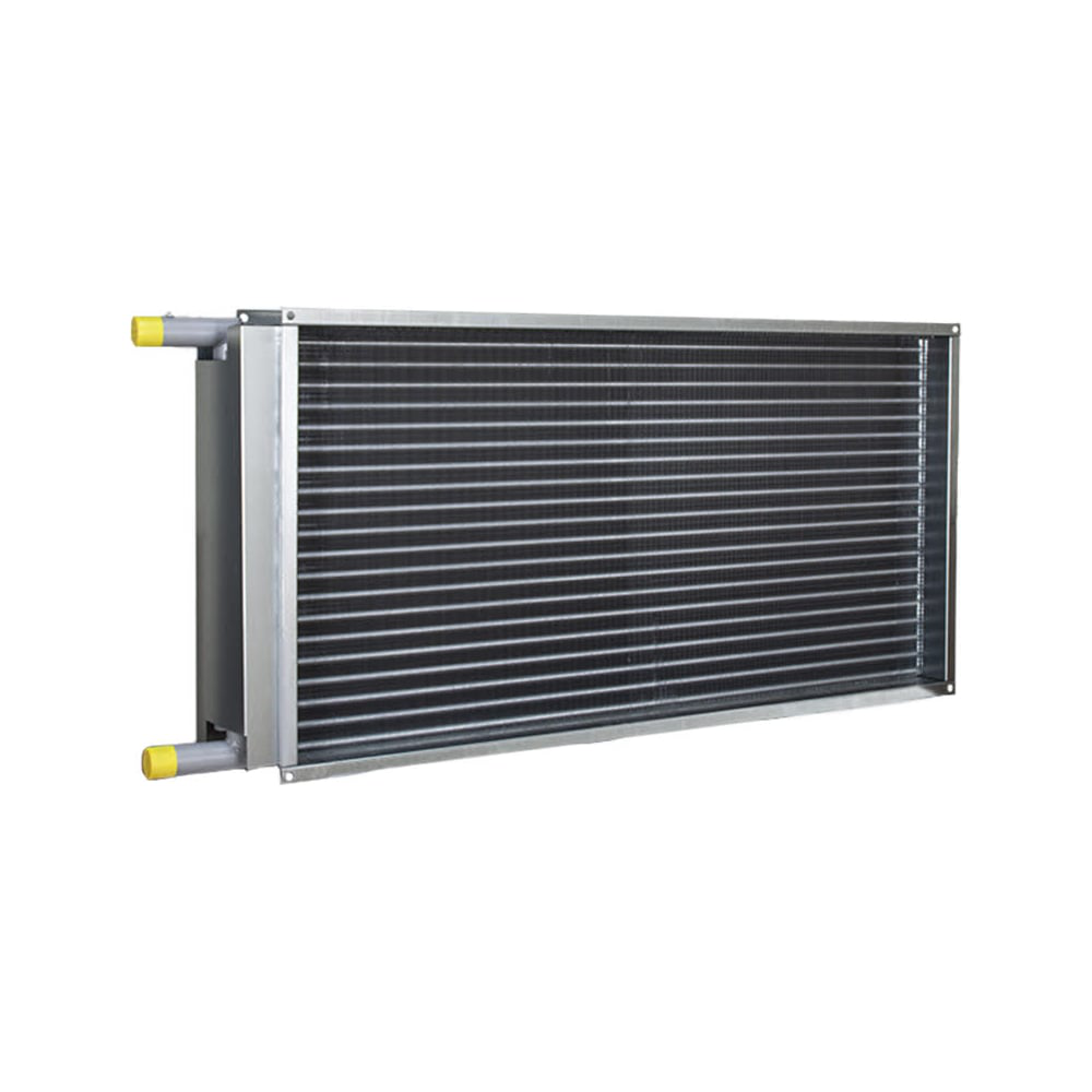 Теплообменник состоит из одного или более рядов медных трубок с внешним диаметром 12 мм, оребренных теплообменными элементами в виде гофрированных пластин из алюминиевой фольги толщиной 0,12…0,25 мм. Трубки объединены в группы, концы которых впаяны в коллекторы из стальных или медных труб, через которые осуществляется вход и выход теплоносителя или хладагента. Для соединения с внешней системой на коллекторах имеются специальные патрубки, обеспечивающие сварное, резьбовое или фланцевое соединение. Нагрев или охлаждение воздуха происходит при его прохождении через теплообменник в процессе взаимодействия с медными трубками и алюминиевыми пластинами.