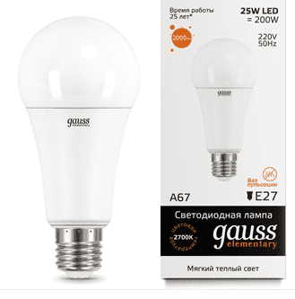 Лампа Gauss LED Elementary A67 25W E27 2700K 1/10/50 Аналог лампы накаливания, Вт: 200Время работы, ч: 25000