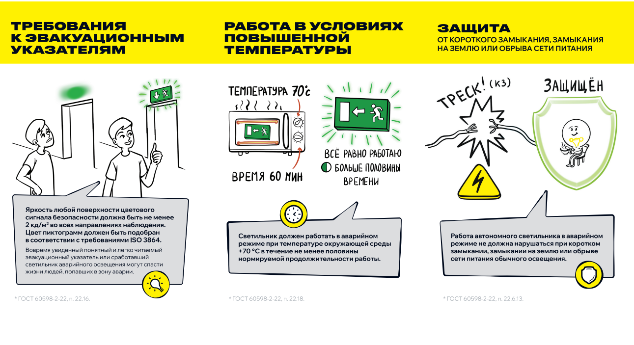 Используются для обозначения эвакуационных выходов, а также для различных информационных целей в помещениях с высоким уровнем содержания влаги и пыли. Соответствуют ГОСТ Р МЭК 60598-1, ГОСТ Р МЭК 60598-2-22.
