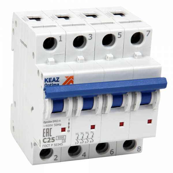 Модульный автоматический 4 полюсный выключатель переменного тока с предельной коммутационной способностью при переменном токе 6 кА на номинальный ток 3 А .